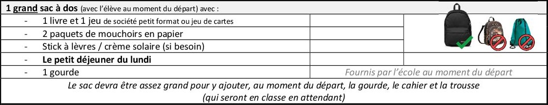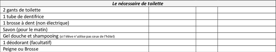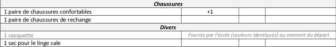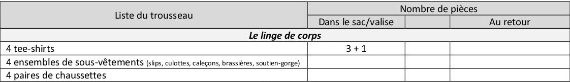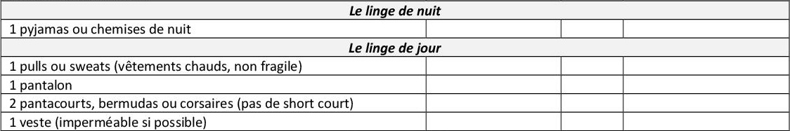 Cette liste est indicative pour un séjour de trois jours. Il est inutile de prévoir des vêtements neufs… bien au contraire… Nous ne pouvons pas vous assurer que les vêtements reviendront dans un état « comme neuf ». Il est très important que les enfants sachent reconnaître leurs vêtements. Au moment de faire la valise, vous devrez noter dans la colonne « Dans le sac/valise », le nombre de pièces de chaque sorte et ne pas oublier que les vêtements portés le jour du départ devront être compris dans cet inventaire (Exemple : Tee-shirts : 3 + 1 déjà porté le jour du départ).